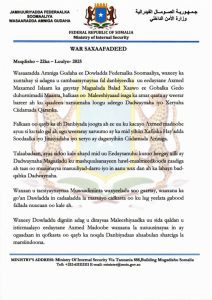 Wasaaradda Amniga Gudaha ee Dowladda Federaalka Soomaaliya, waxay ka xuntahay, si adagna u cambaaraynaysaa fal dambiyeedka uu eedaysane Axmed Maxamed Islaam ka gaystay magaalada Beledxaawo ee gobolka Gedo duhurnimadii maanta, halkaas oo maleeshiyaad isaga ka amar qaata ay weerar bareer ah ku qaadeen xarumaha loogu adeego dadweynaha iyo xeryaha ciidamada qaranka.