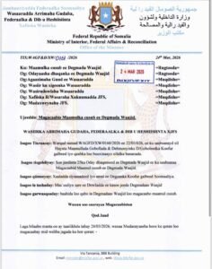 Warqadda Magacaabista ah oo uu ku saxiixan yahay Wasiirka Wasaaradda Arrimaha Gudaha, Federaalka & Dib u heshiisiinta Xukuumadda Federaalka Soomaaliya ayaa lagu sheegay in magacaabistaan ay timid kaddib markii laga maarmi waayay.