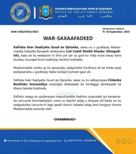 Xafiiska Xeer Ilaaliyaha Guud ee Qaranka oo Maxkamadda gobolka Banaadir hor geeyay eedeysane Cali Dhagadiish, kaa oo lagu eedeeyay in ilmo yar uu god ku riday kuna aasay l, isaga oo kadib ka duubay muuqaal uu ku baahiyay Baraha Bulshada.